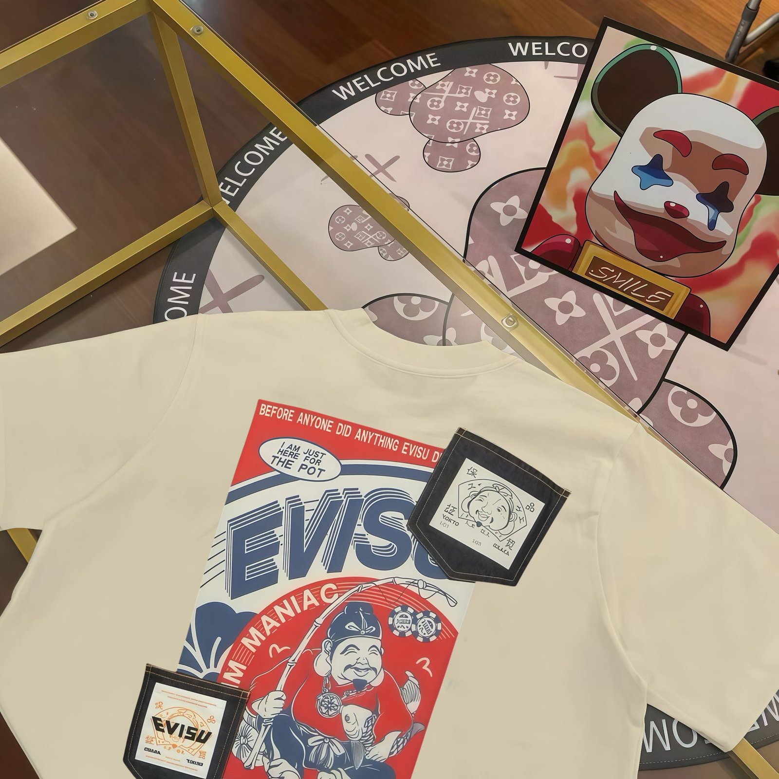 EVISU Fukushin 2024 Winter New Products Men’s Buddha Head Fishing Pocket Print Short Sleeve T-shirt